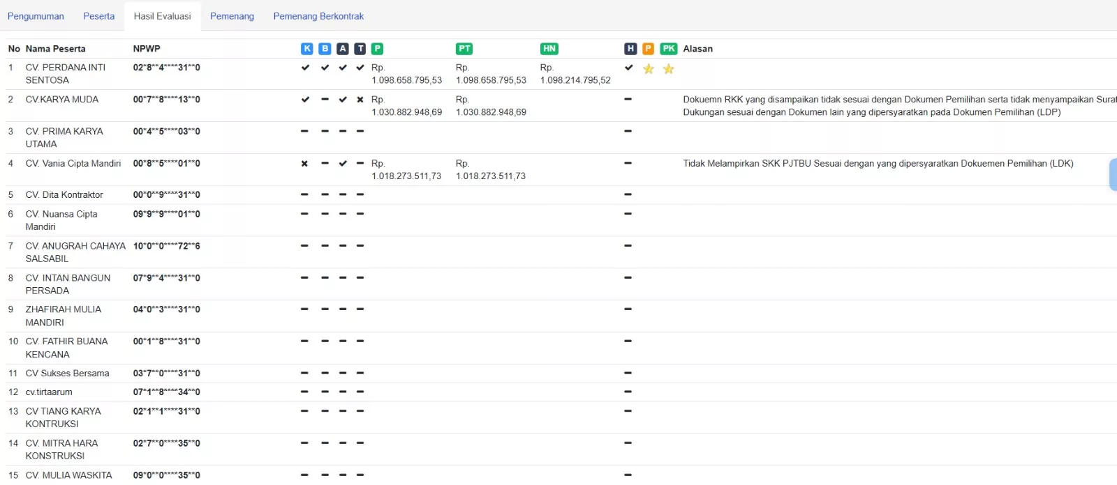 Nasib serupa menimpa CV. Karya Muda. Langkahnya terhenti karena "Dokumen RKK yang disampaikan tidak sesuai" dan "tidak menyampaikan Surat Dukungan" yang dipersyaratkan. Dua batu sandungan administrasi ini membuat dua penawar termurah otomatis keluar dari gelanggang.