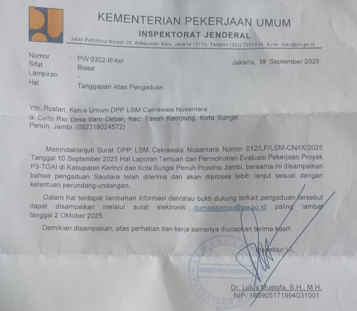 "Menindaklanjuti Surat DPP LSM Cakrawala Nusantara Nomor 012/LP/LSM-CN/IX/2025... bersama ini disampaikan bahwa pengaduan Saudara telah diterima dan akan diproses lebih lanjut sesuai dengan ketentuan perundang-undangan," demikian bunyi kutipan surat yang ditandatangani oleh Inspektur VI, Dr. Lulus Mustofa, S.H., M.H.