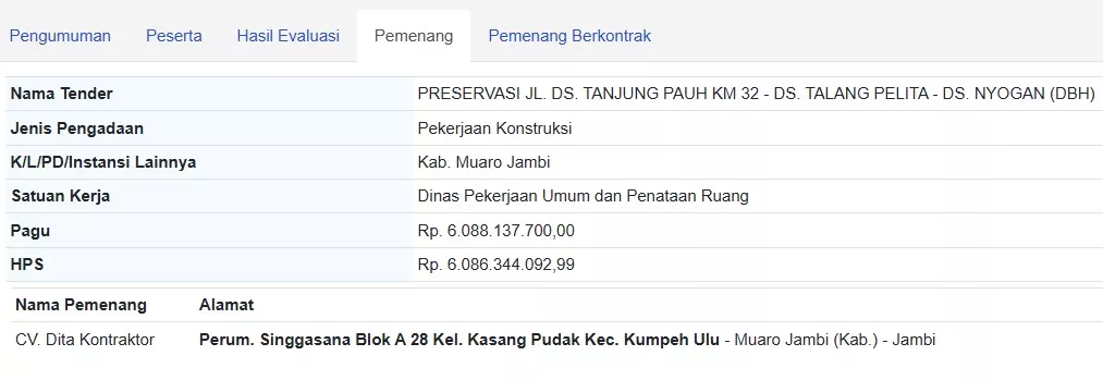 Dengan mundurnya 15 pesaing, jalan CV. Dita Kontraktor untuk memenangkan tender ini menjadi sangat mulus. Perusahaan yang beralamat di Perum. Singgasana, Kumpeh Ulu, Muaro Jambi ini mengajukan penawaran awal Rp 5.961.172.305,00.