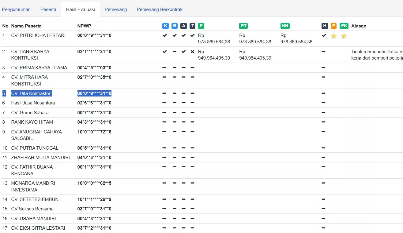 Yang membuat kejanggalan ini semakin menarik, nama-nama perusahaan pemenang tender di atas (CV. PUTRI ICHA LESTARI, CV. YUDHA KARYA, CV. DAVID DEWANTARA PUTRA, dan CV. MITRA PRIMA UTAMA) adalah bagian dari 15 perusahaan yang sebelumnya serentak tak memasukkan penawaran dari proyek Preservasi Jalan Desa Tanjung Pauh yang akhirnya dimenangkan oleh CV. Dita Kontraktor.