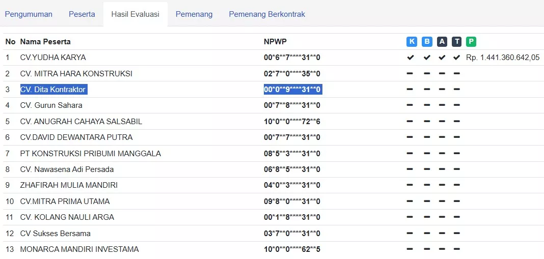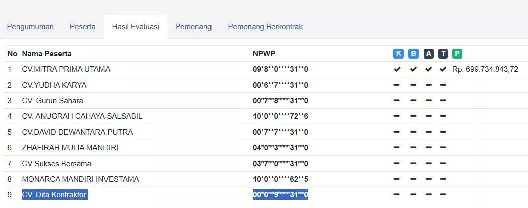 Bahkan untuk proyek dengan nilai lebih kecil, seperti Pengaspalan Pelataran Pendopo Kantor Bupati senilai Rp 700 juta, pola yang sama berulang. CV. Dita Kontraktor tercatat sebagai peserta nomor urut 9 dan lagi-lagi memilih tidak mengajukan penawaran. Proyek ini jatuh ke tangan CV. MITRA PRIMA UTAMA.