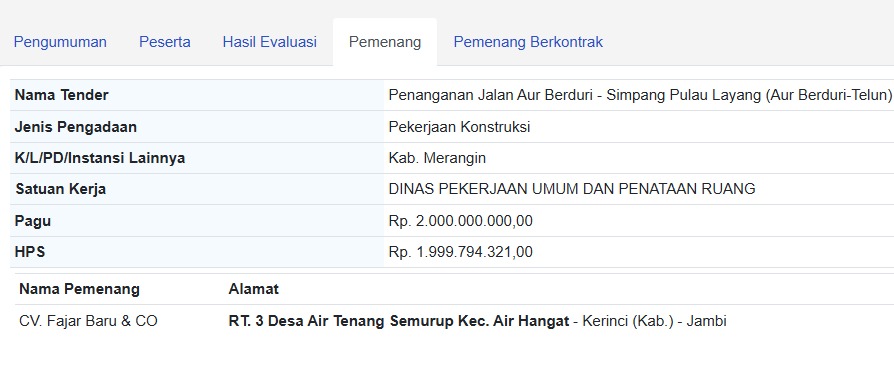 Tender yang menggunakan metode pascakualifikasi satu file dengan sistem harga terendah ini tercatat diikuti oleh 7 peserta. Namun, dari 7 perusahaan yang bersaing, CV. Fajar Baru & CO yang beralamat di Desa Air Tenang Semurup, Kecamatan Air Hangat, Kabupaten Kerinci, keluar sebagai pemenang.
