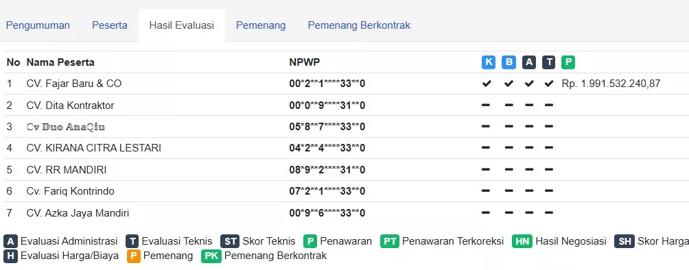 Harga penawaran yang diajukan CV. Fajar Baru & CO adalah Rp 1.991.532.240,87, dan setelah dikoreksi menjadi Rp 1.991.532.240,88. Ini berarti, penawaran pemenang hanya turun sekitar Rp 8,2 juta atau hanya 0,4% lebih rendah dari HPS yang sudah 'mepet' pagu.