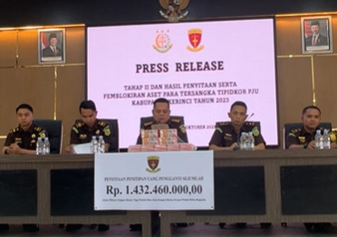 Sungai Penuh - Kejaksaan Negeri (Kejari) Sungai Penuh menyita uang pengganti senilai Rp 1,432 miliar dari tujuh tersangka dalam kasus dugaan korupsi proyek Penerangan Jalan Umum (PJU) di Kabupaten Kerinci Tahun Anggaran 2023. Selain uang tunai, aset lain berupa mobil, motor, dan belasan bidang tanah milik para tersangka turut diamankan.