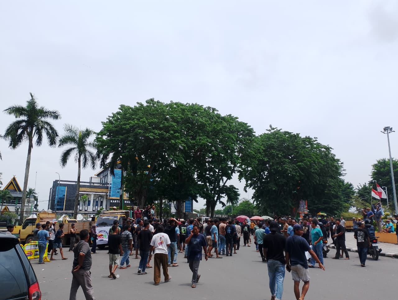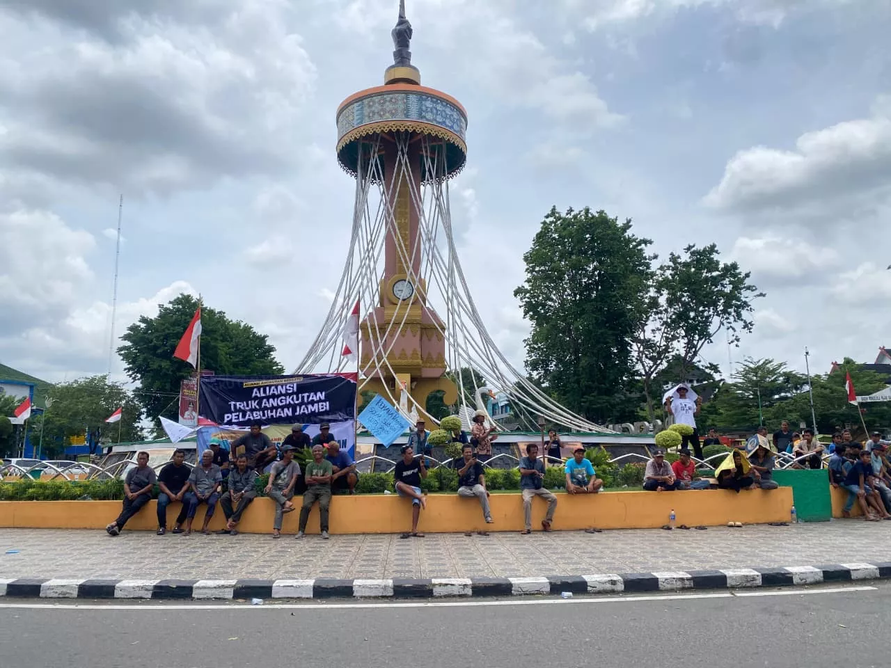 Klakson truk bersahut-sahutan memecah udara pagi sejak pukul delapan. Kawasan ikonik Kota Jambi itu sontak berubah menjadi lautan kendaraan. Barisan truk pasir, truk batu bata, hingga bus wisata terparkir rapat, memaksa lalu lintas dialihkan.