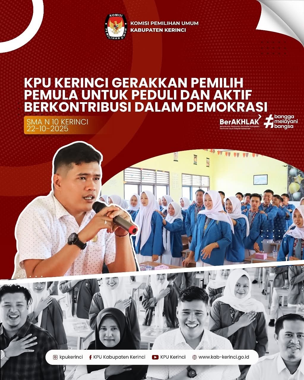 Kegiatan tersebut dilaksanakan pada Selasa (22/10/2025) di SMA Negeri 10 Kerinci, dan dihadiri oleh Anggota KPU Kabupaten Kerinci Prima Pribadi Putra, Anggota DPRD Kabupaten Kerinci, serta perwakilan Badan Kesbangpol Kabupaten Kerinci.