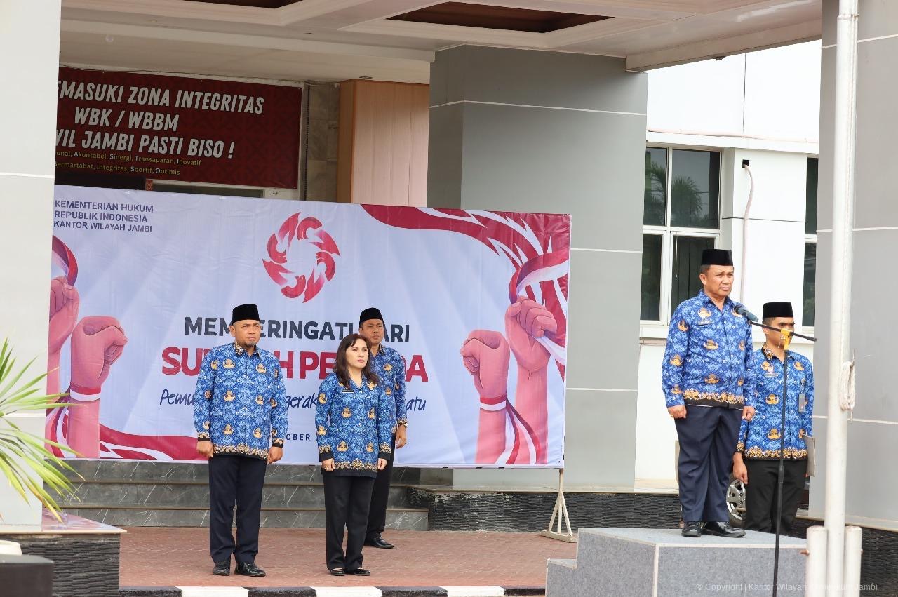 Kantor Wilayah Kementerian Hukum Jambi menggelar Upacara Peringatan Hari Sumpah Pemuda ke-97 Tahun 2025 di Lapangan Upacara, Selasa (28/10/2025). Kegiatan tersebut dihadiri oleh Kepala Kantor Wilayah, Jonson Siagian selaku Pembina Upacara dan pegawai dari Kanwil Kementerian Hak Asasi Manusia Jambi. Kakanwil HAM Sukiman turut hadir mengikuti upacara bersama dengan Kadiv Yankum, Kortini JM Sihotang.