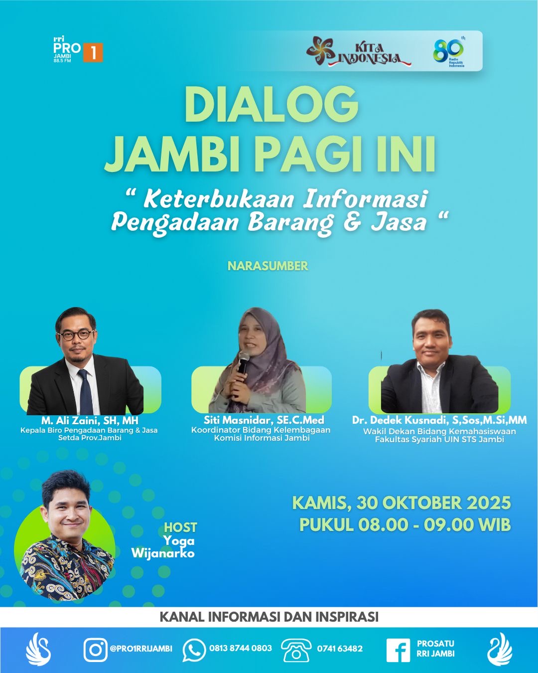 Ia akan berdialog bersama dua narasumber kunci lainnya, yakni Kepala Biro Pengadaan Barang & Jasa Setda Prov. Jambi, M. Ali Zaini, SH, MH, dan Koordinator Bidang Kelembagaan Komisi Informasi Jambi, Siti Masnidar, SE.C.Med.