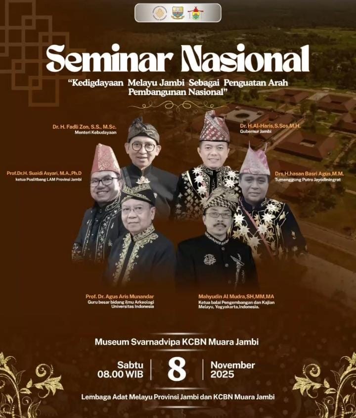 Lembaga Adat Melayu (LAM) Provinsi Jambi akan menggelar Seminar Nasional dengan tema 'Kedigdayaan Melayu Jambi Sebagai Penguatan Arah Pembangunan Nasional'. Acara akbar ini akan berlangsung di Museum Swarnadwipa KCBN Candi Muaro Jambi pada hari ini, Sabtu, 8 November 2025.