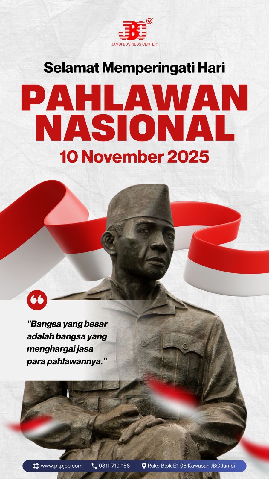 “Mari kita maknai semangat perjuangan para pahlawan sebagai inspirasi untuk melangkah maju—berani, berintegritas, dan berkontribusi bagi negeri,” demikian pesan inspiratif yang disampaikan JBC dalam memperingati Hari Pahlawan tahun ini.