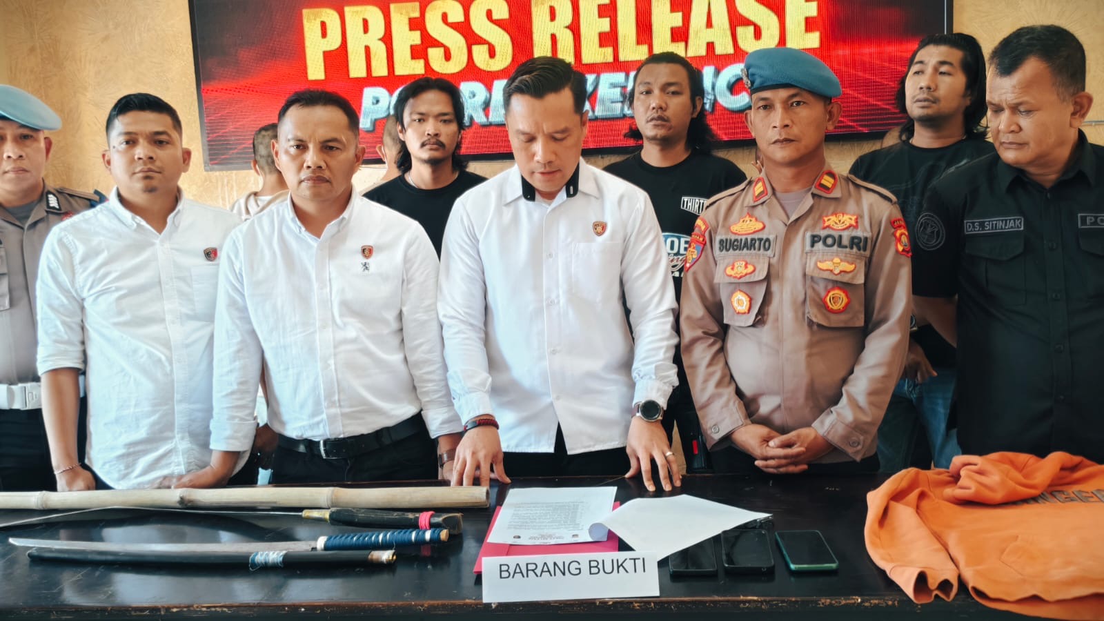Barang bukti yang disita antara lain 1 bilah celurit, 1 bilah samurai, 1 batang bambu, 1 HP Redmi 10A, serta dua sepeda motor Honda Beat dan Yamaha Vixion.