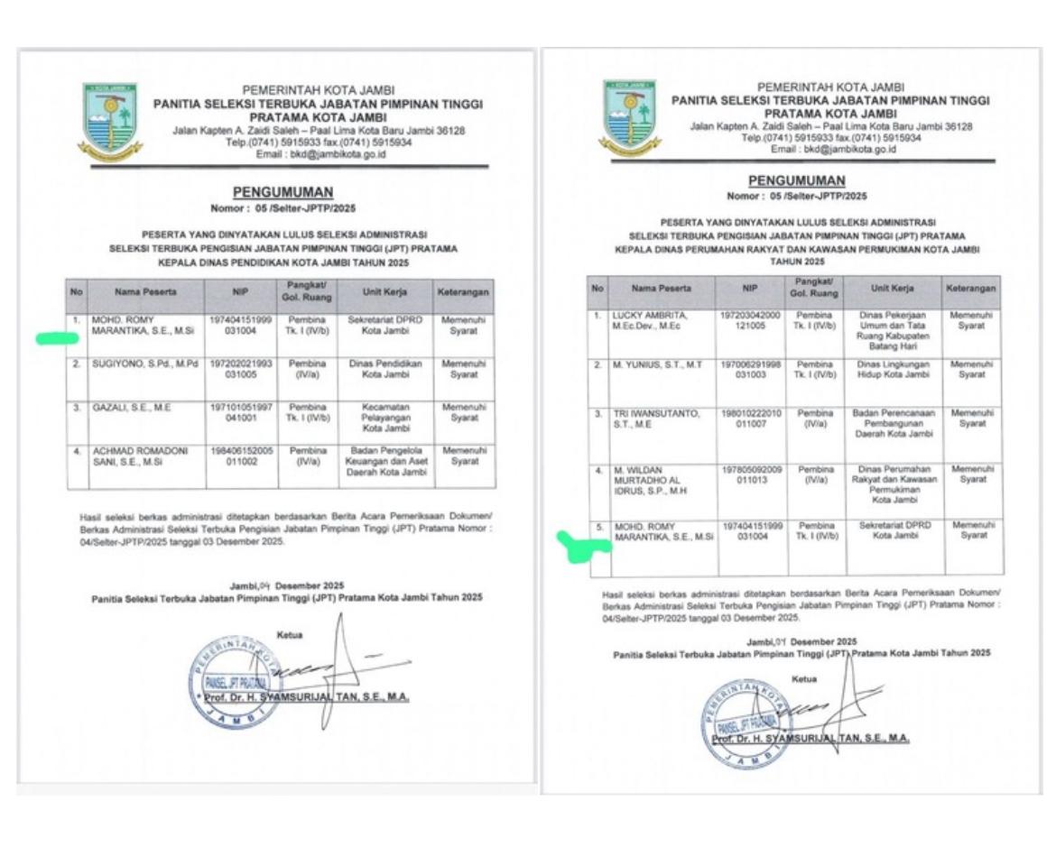 Penelusuran Jambi Link dalam lampiran pengumuman tersebut menunjukkan nama Mohd. Romy Marantika muncul di dua daftar terpisah: