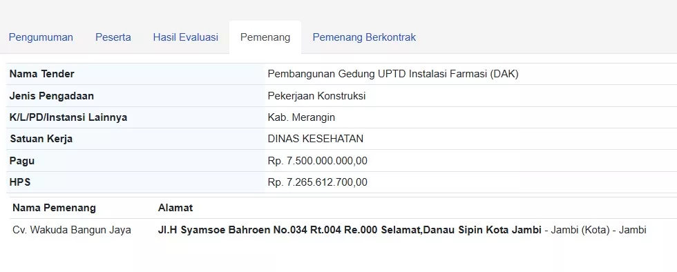 Sebagai informasi, proyek Pembangunan Gedung UPTD Instalasi Farmasi ini memiliki nilai pagu sebesar Rp 7.500.000.000, dan ditenderkan secara terbuka oleh Pemerintah Kabupaten Merangin melalui LPSE.