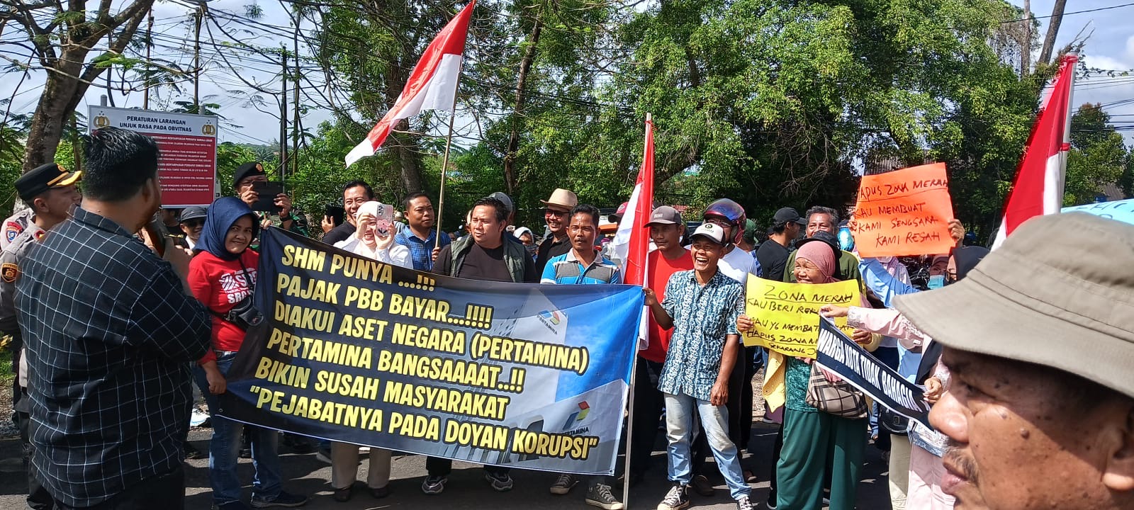 "Kami ini punya sertifikat tanah. Kenapa pihak Pertamina seenaknya menetapkan zona merah? Kami hanya mau mempertahankan hak kami," teriak salah satu orator di lokasi aksi.