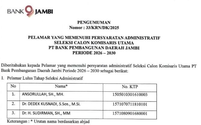 Jambi - Bursa pemilihan Komisaris Utama (Komut) PT Bank Pembangunan Daerah Jambi (Bank Jambi) periode 2026–2030 semakin memanas. Panitia seleksi telah resmi mengumumkan tiga nama yang lolos tahapan administrasi dan siap bersaing di tahap selanjutnya.