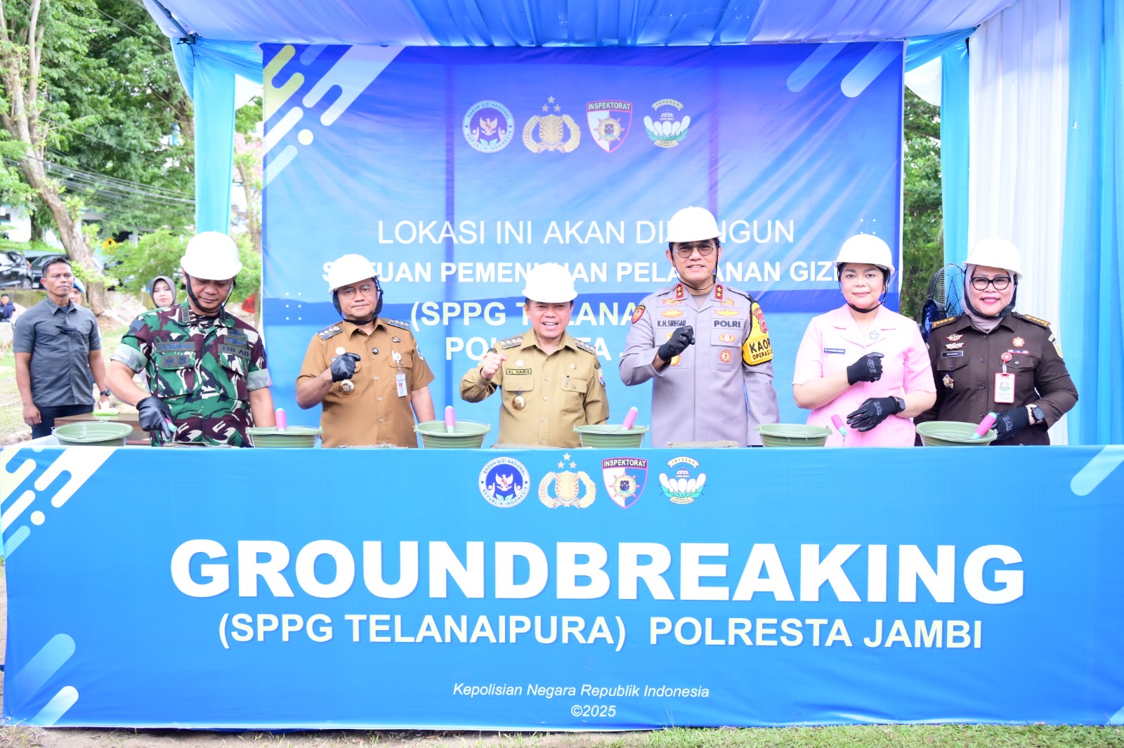 Polda Jambi melaksanakan kegiatan Ground Breaking Satuan Pelayanan Pemenuhan Gizi (SPPG) Serentak secara Daring yang terpusat di SPPG Polsek Telanaipura, Polresta Jambi, Senin (29/12/2025)