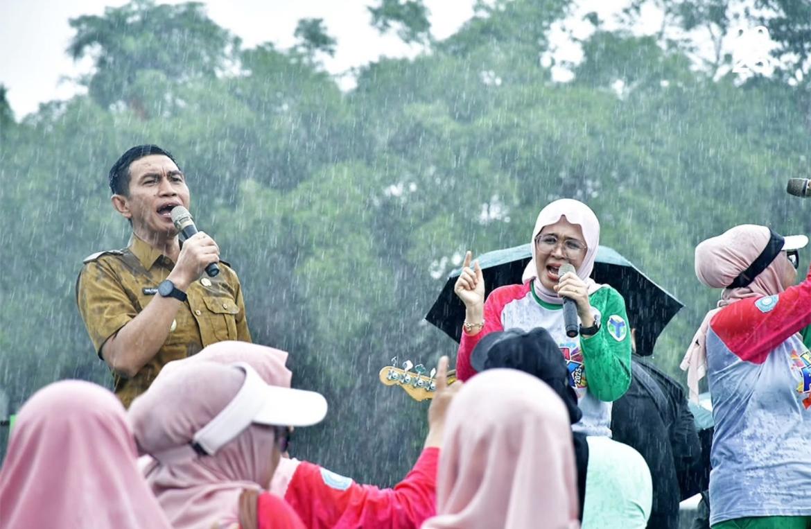 Justru, Bupati Fadhil Arief dan Ibu Zulva Fadhil terlihat semakin antusias. Keduanya naik ke panggung dan berduet menyanyikan lagu kesayangan mereka. Mengabaikan guyuran hujan, pasangan pemimpin daerah ini bernyanyi bersama peserta, menciptakan suasana yang hangat dan penuh keakraban.