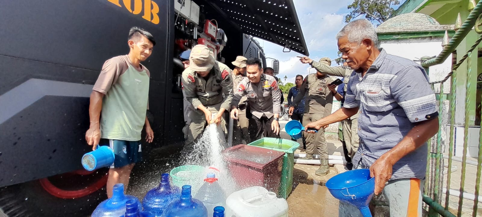 Satbrimob Polda Jambi memberikan bantuan air bersih untuk masyarakat mengalami kekeringan kekeringan sumur akibat musim kemarau di Desa Danau Lamo, Kecamatan Muaro Sebo, Kabupaten Muarojambi pada Rabu,14 Agustus 2024.