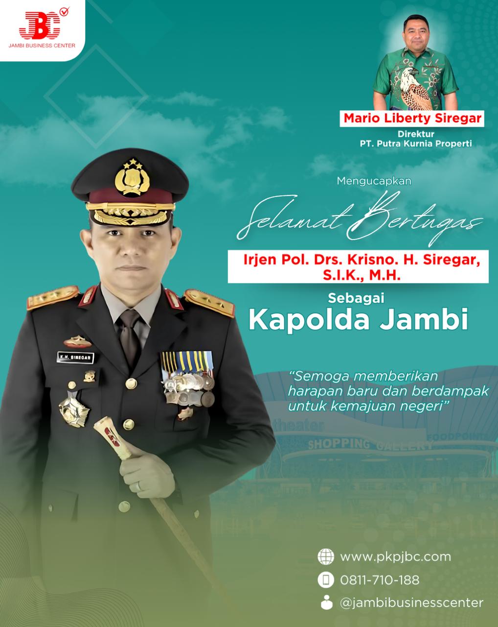 Jambi – PT. Putra Kurnia Properti Proyek Jambi Business Center mengucapkan selamat kepada Irjen Pol. Drs. Krisno H. Siregar, S.I.K., M.H. yang baru saja dilantik sebagai Kepala Kepolisian Daerah (Kapolda) Jambi. Ucapan ini disampaikan secara khusus oleh perusahaan yang bergerak dalam pengembangan properti di Provinsi Jambi, sebagai bentuk dukungan dan harapan terhadap kepemimpinan baru di Polda Jambi.