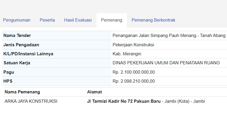 Arka Jaya Konstruksi, perusahaan asal Kota Jambi, menyodorkan penawaran tunggal di angka Rp 2.090.068.000,10. Angka ini hanya terpaut tipis, sekitar Rp 8,14 juta dari HPS, atau setara 99,6 persen dari nilai perkiraan. Efisiensi anggaran yang dihasilkan dari lelang ini terbilang minim.
