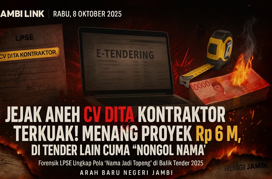 Muaro Jambi - Kejanggalan tender proyek Preservasi Jalan Desa Tanjung Pauh Rp 6 miliar di Muaro Jambi yang dimenangkan CV. Dita Kontraktor kian menguat. Usai melenggang mulus setelah 15 perusahaan mundur misterius, jejak digital CV. Dita Kontraktor di sejumlah proyek lain kini terkuak dan menampilkan pola yang tak biasa.
