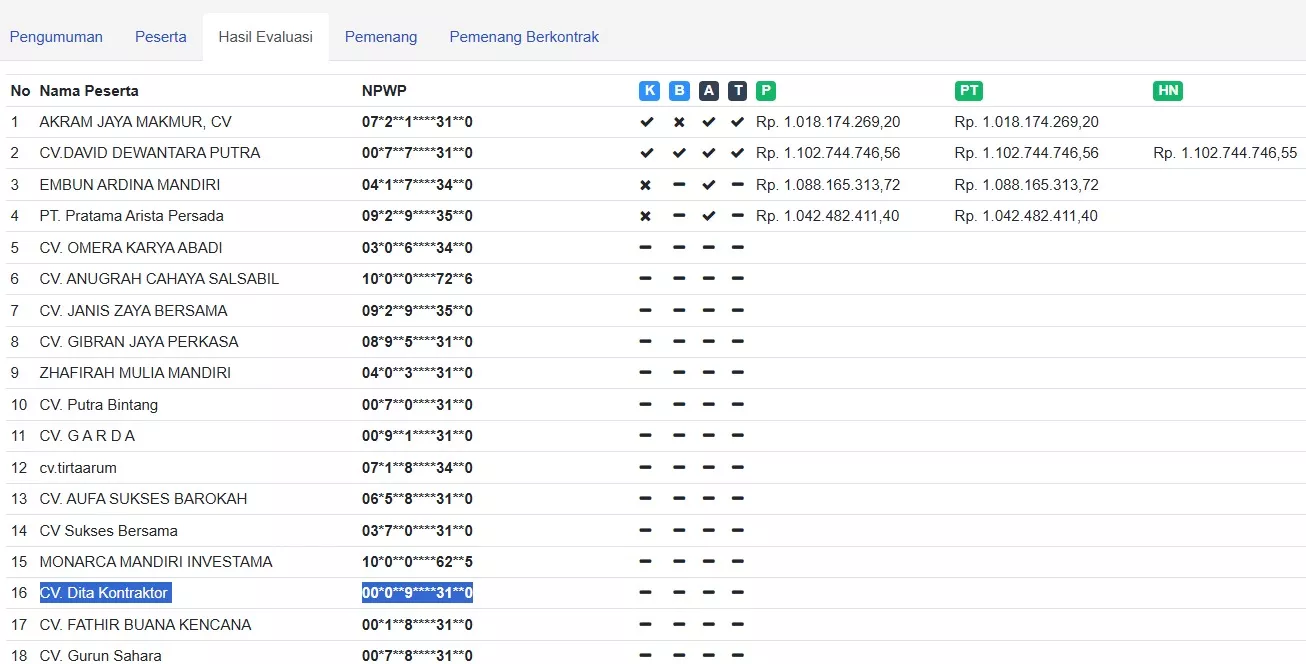 Bahkan untuk proyek dengan nilai lebih kecil, seperti Pengaspalan Pelataran Pendopo Kantor Bupati senilai Rp 700 juta, pola yang sama berulang. CV. Dita Kontraktor tercatat sebagai peserta nomor urut 9 dan lagi-lagi memilih tidak mengajukan penawaran. Proyek ini jatuh ke tangan CV. MITRA PRIMA UTAMA.