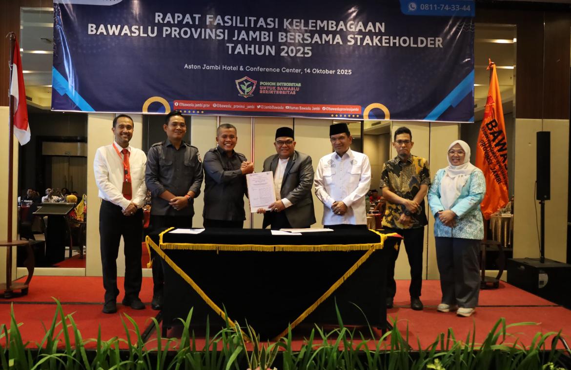Guna memperkuat kelembagaan Bawaslu, Bawaslu Provinsi Jambi menggelar Rapat Fasilitasi Kelembagaan Bawaslu Provinsi Jambi dengan Stakeholder. Hadir dalam kegiatan sejumlah stakeholder terkait seperti Dinas Kominfo Provinsi Jambi, BKD Provinsi Jambi, Komisioner Komisi Informasi Provinsi Jambi, Rektor Perguruan Tinggi di Jambi, Pengurus Lembaga Adat Melayu Jambi dan jajaran Bawaslu Provinsi Jambi bersama Bawaslu Kabupaten/Kota, yang berlangsung Selasa (14/10/2025) di kawasan Simpang Pulai Kota Jambi.